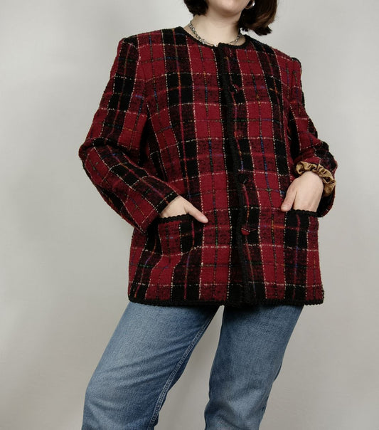 giacca vintage modello blazer bouclè fantasia tartan rosso e nero