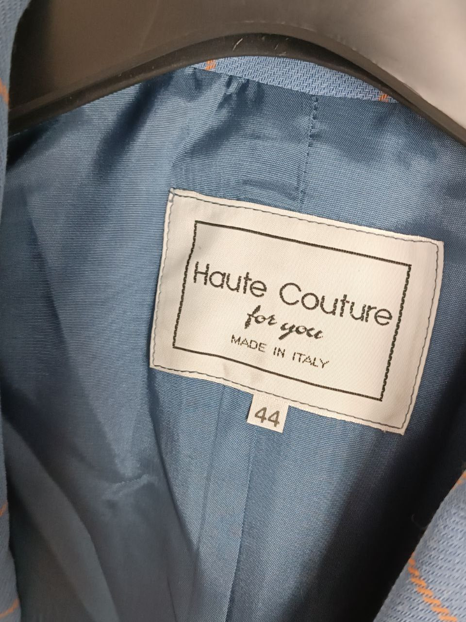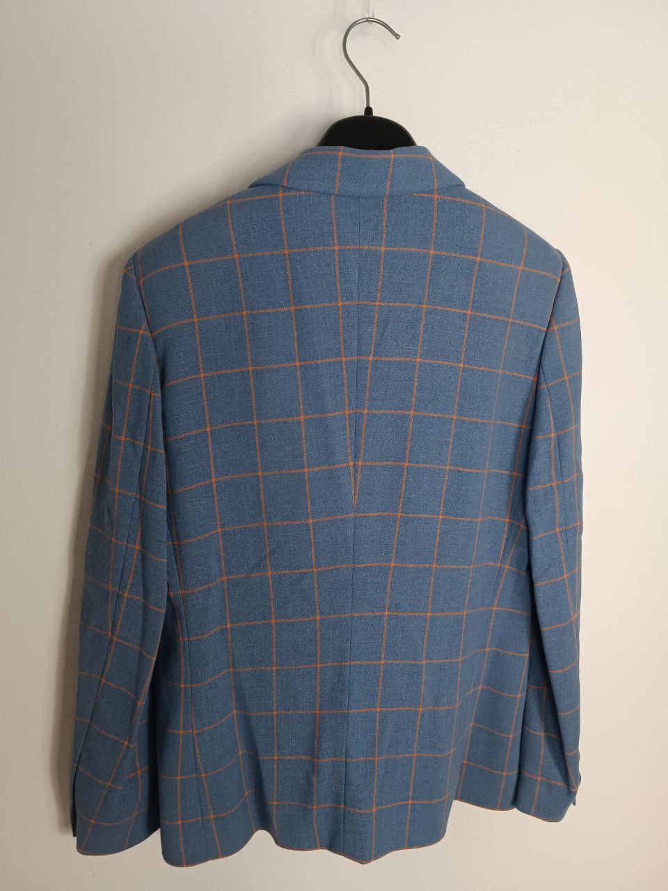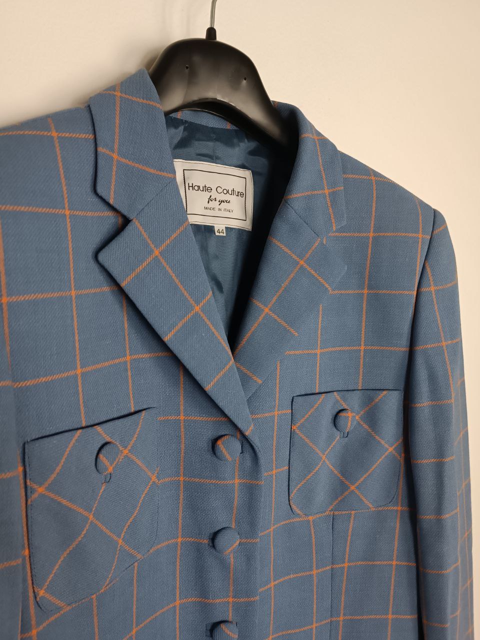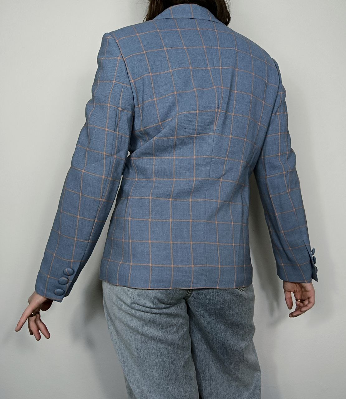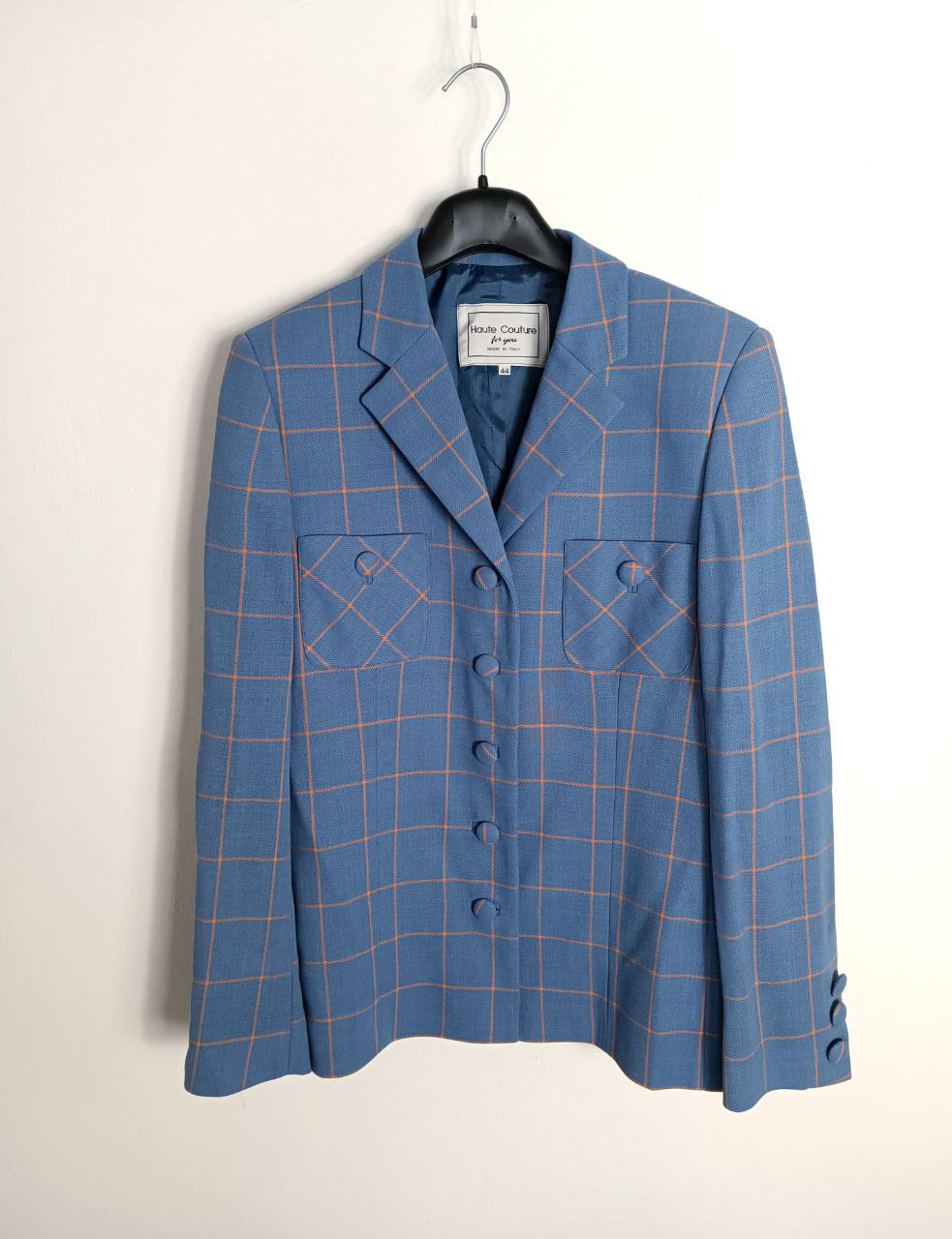 Vintage tailored blazer jacket single-breasted patterned patterned blazer jacket in pastel blue / sugar paper and orange pure wool covered buttons, classic cut, lined , in like new condition In photo worn by a size S 40 IT height 1.68 m but fits up to a size M 42 IT ( measurements in photo) If you need more information please do not hesitate to contact me