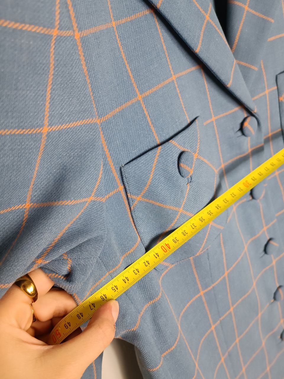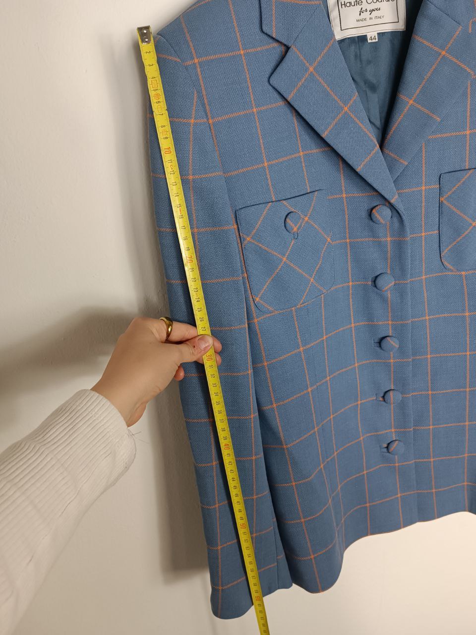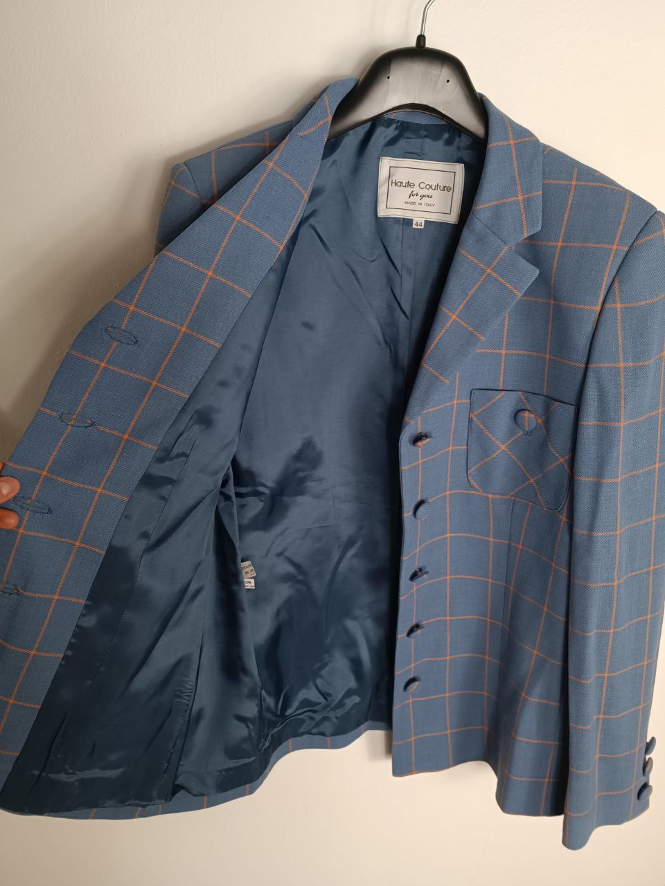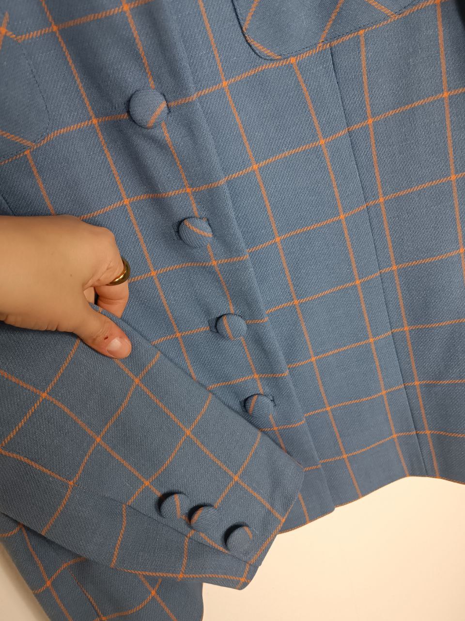 Giacca blazer sartoriale vintage modello monopetto a fantasia a quadri azzurro pastello / carta da zucchero e arancione in pura lana bottoni ricoperti, taglio classico, foderato , in condizioni pari al nuovo In foto indossato da una tg S 40 IT altezza 1,68 m ma veste fino a una tg M 42 IT ( misure in foto) Se hai bisogno di altre informazioni non esitare a contattarmi