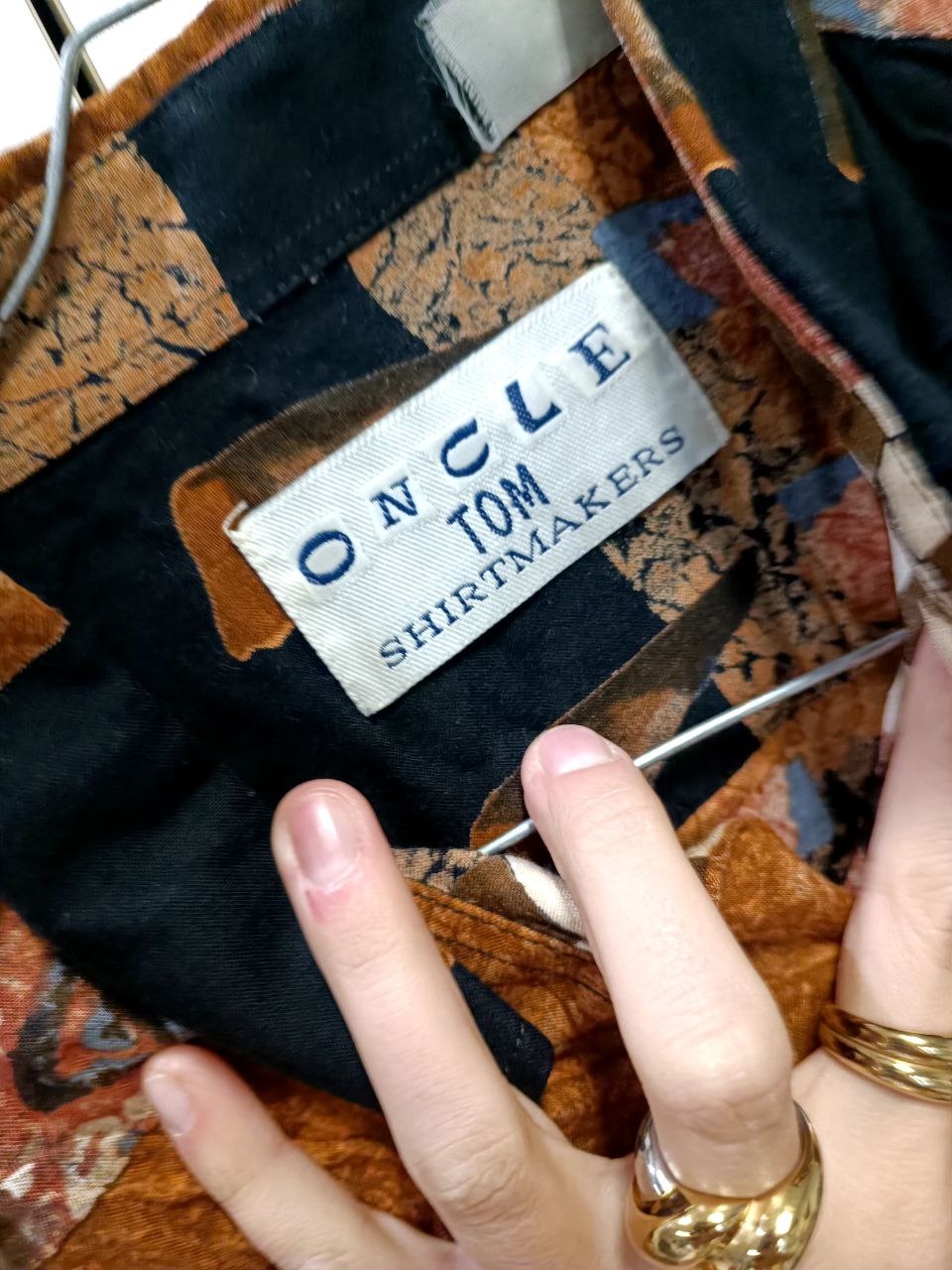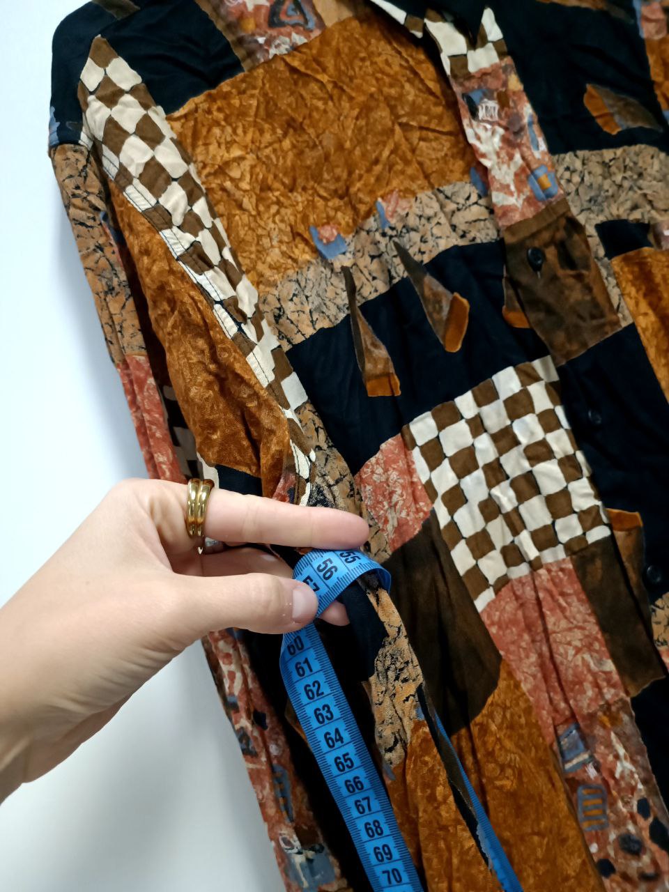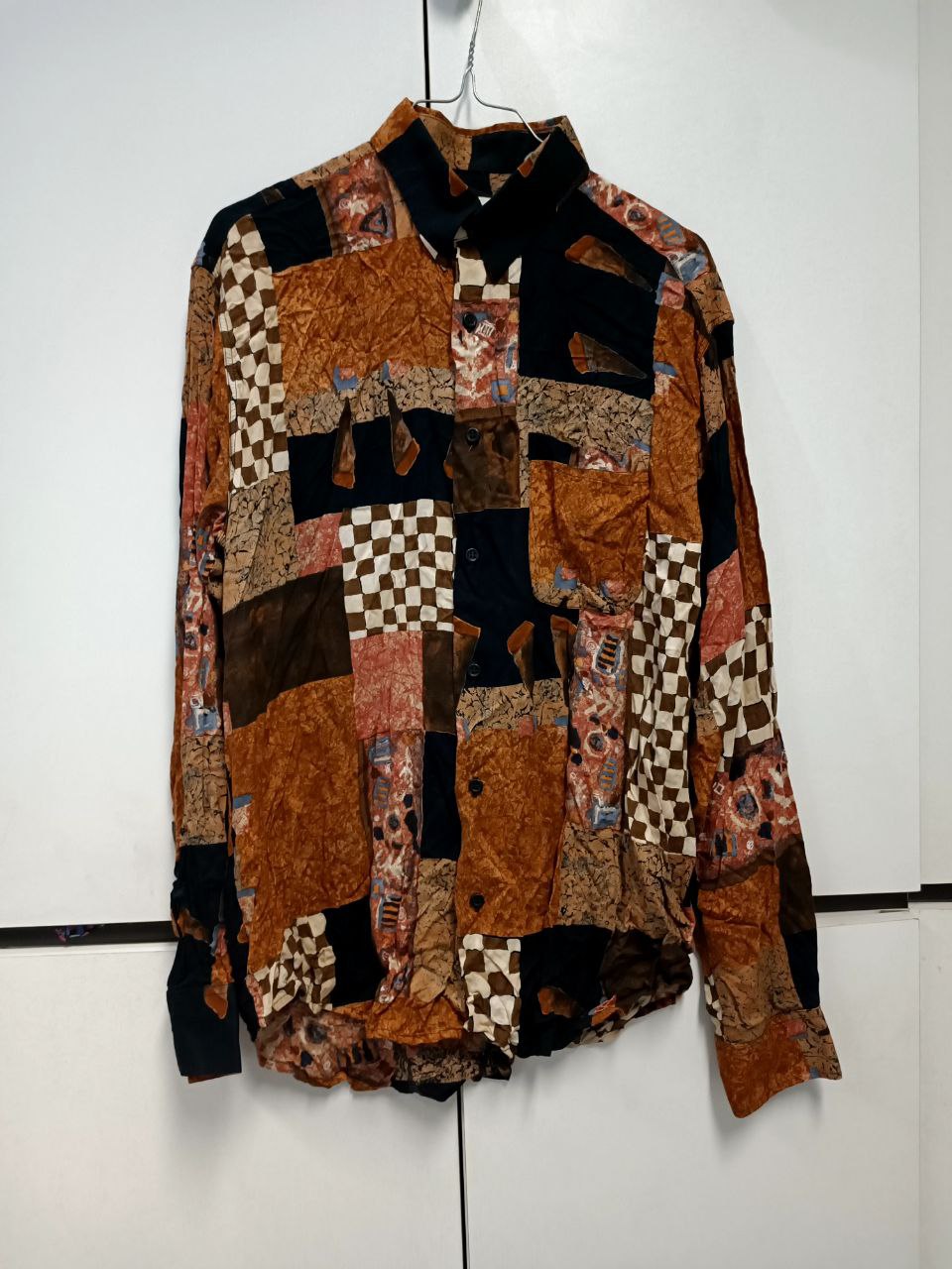 Camicia vintage anni 80 in viscosa con stampa fantasia astratta / funky stile patchwork con scacchi e disegni sui toni dell'arancione, marrone e beige Vestibilità morbida, maniche leggermente a sbuffo, colletto classico Si presenta in perfette condizioni In foto indossato da una tg S 40 It altezza 1,68 m ma veste fino a una tg XL 46 IT Misure prese a capo steso: spalle 46 cm, distanza ascella ascella 56 cm, lunghezza busto 71 cm, lunghezza manica 60 cm Se hai bisogno di altre informazioni non esitare a contattarmi!