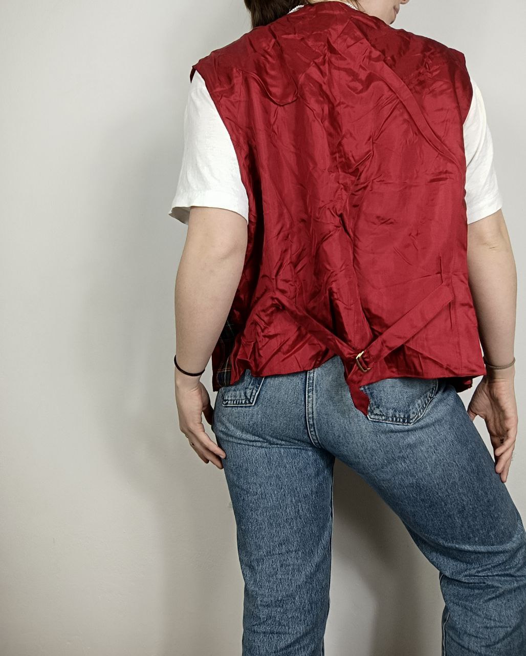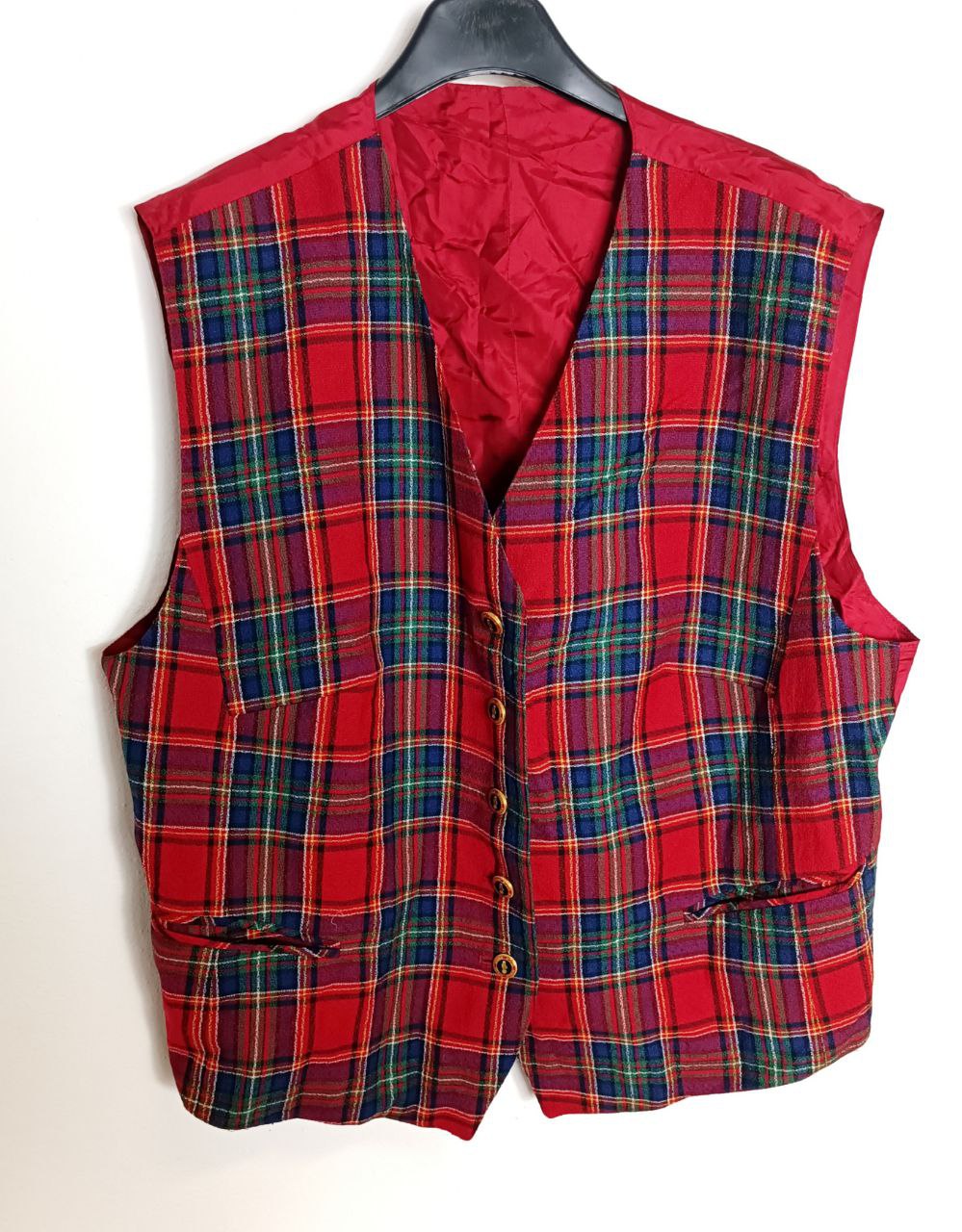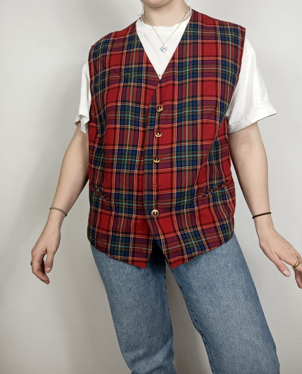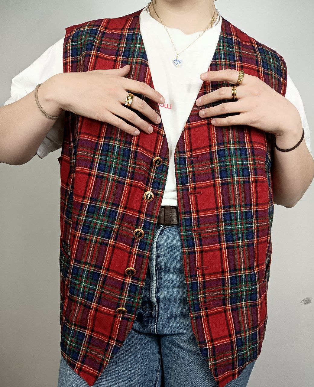 Vintage wool vest with tartan plaid print in shades of red, green and blue. Perfect for those who love retro, preppy or cottagecore style! Perfect for casual chic looks! Wear it over a shirt or turtleneck for a super stylish and original outfit. Great for both men and women pictured worn by a size S 40 IT height 1.68 m but fits up to a size XL 46 IT